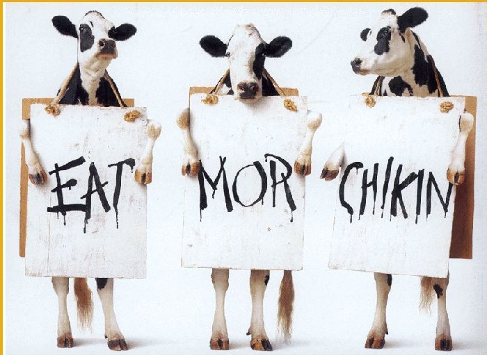 Zudem haben ja bekanntermassen die Huehner die Kuehe gegen sich. Kuehe fordern aus gutem Grund: "Esst mehr Huehner!". Ich weigere mich, die Frage zu eroertern, inwiefern Huehner und Kuehe dasselbe sein koennten. Sieht man ja staendig im TV.