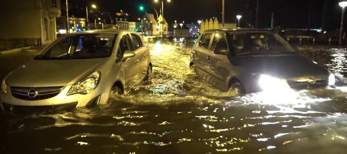 NEVER take an electric car into a flooded area! If You are already there: bad luck! At least You should make sure Your garage is not in a risky location! If not You better park Your e-car on the roof.